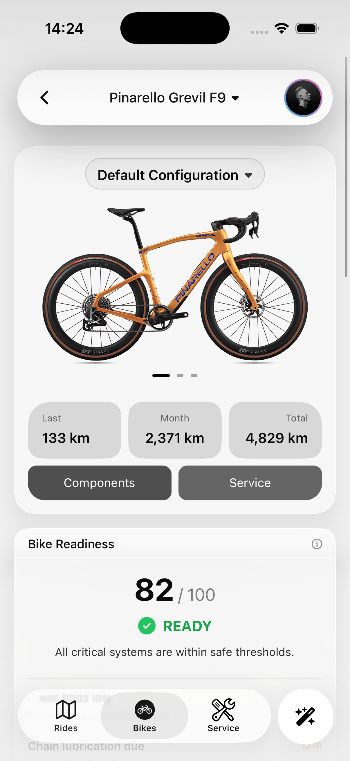 Your bike’s Readiness is a data-backed calculation. Know exactly how much life is left in your gear before you clip in for your next ride.
